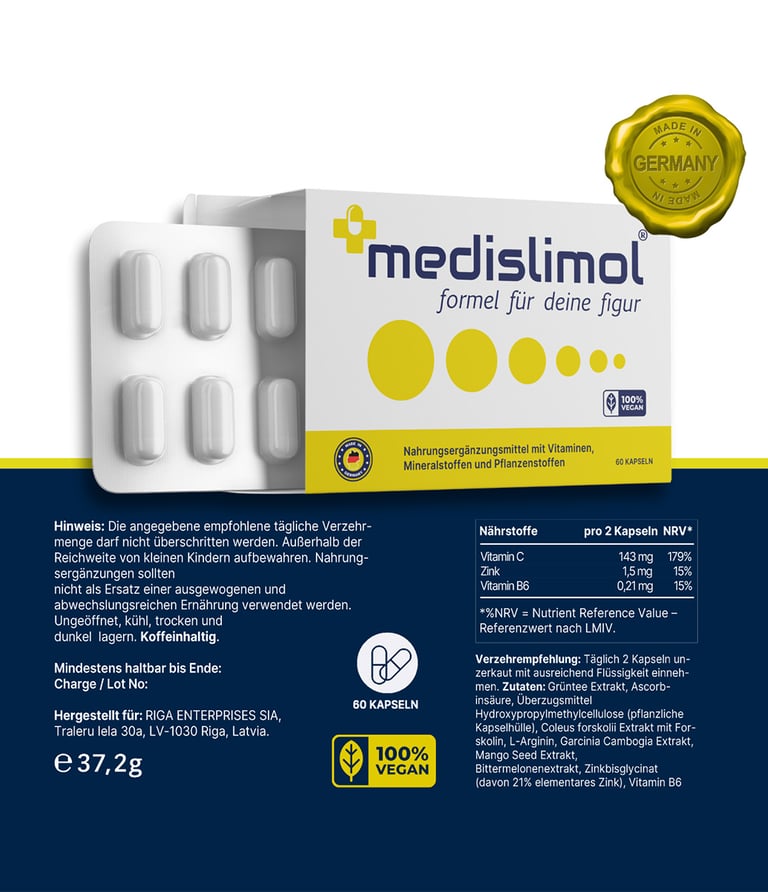 Medislimol Capsules zijn een voedingssupplement dat zich richt op het ondersteunen van de natuurlijke processen in ons lichaam. Ze zijn samengesteld uit 100% natuurlijke ingrediënten, zonder kunstmatige toevoegingen, chemicaliën of stimulerende middelen. Dit maakt ze geschikt voor veganisten en mensen met een glutenvrij dieet. De capsules zijn niet-GMO en worden geproduceerd met aandacht voor kwaliteit, wat belangrijk is in een markt vol met synthetische alternatieven.